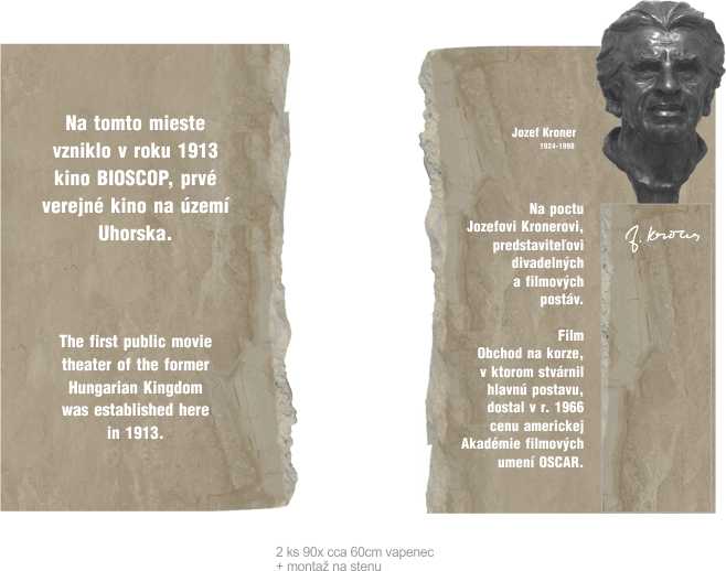 2. Druhá tabuľa je umiestnená súčasne s prvou tabulou a tvoria estetický celok. Bude osadená na poctu Jozefovi Kronerovi, predstaviteľovi divadelných a filmových postáv. Film Obchod na korze, v ktorom stvárnil Kroner hlavnú postavu, dostal v r. 1966 cenu americkej Akadémie filmových umení OSCAR. Súčasne z osadením tabuli budú premietané zahraničné filmy za ktoré dostal Jozef Kroner ocenenia ale na Slovensku zatiaľ neboli nikdy premietané.