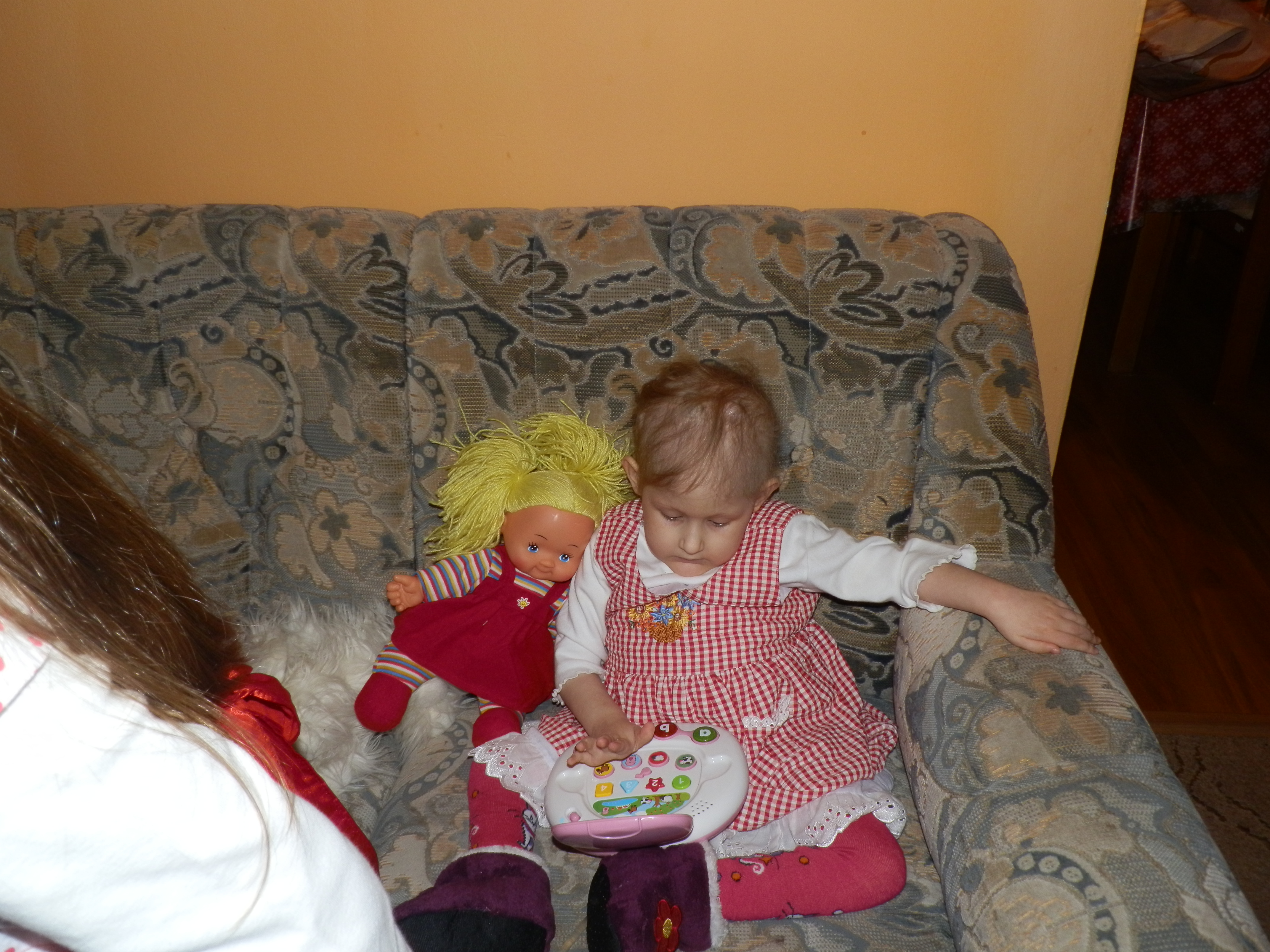 Esterka ma 4.roky nechodi sa plazi alebo sedi pravidelne s nou cvicime je velmi ziva snazi sa pohybovat lekari predpovedali rozne negativne prognozy napr ze bude mat epilepsiu nastastie sa tak nestalo teraz byvame v podnajme kazdy polrok sme byvali na inom mieste dali sme si ziadost o najomny byt vdaka Bohu nam mesto Kosice za kratky cas darovali do podnajmu 2.i.byt stale sme platili drahe podnajmy sme zadlzeni touto cestou by sme chceli poprosit fin.poradcu o radu sme v tazkej fin.situacii peniaze na liecenie nemame dakujeme za kazdy dar manzelka je na predlzenej materskej dovolenke do veku dietata 6.rokov Esterka vyzaduje neustalu opateru 24.hod.denne pomahaju nam aj manz.rodicia Esterka ked bola mensia kazdy mesiac bola v nemocnici prekonala 18x.zapal oblicky lekari nic nerobia nase perfektne zdravotnictvo stale ma problem s oblickou lekari sa boja operovat ma kateter verime a dufame ze bude lepsie chceli by sme ist na liecenie do adeli centra v Piestanoch alebo do Dunajskej Luznej dakujeme vsetkym darcom Nech Vas Boh pozehna s pozravom Martin a Zuzka