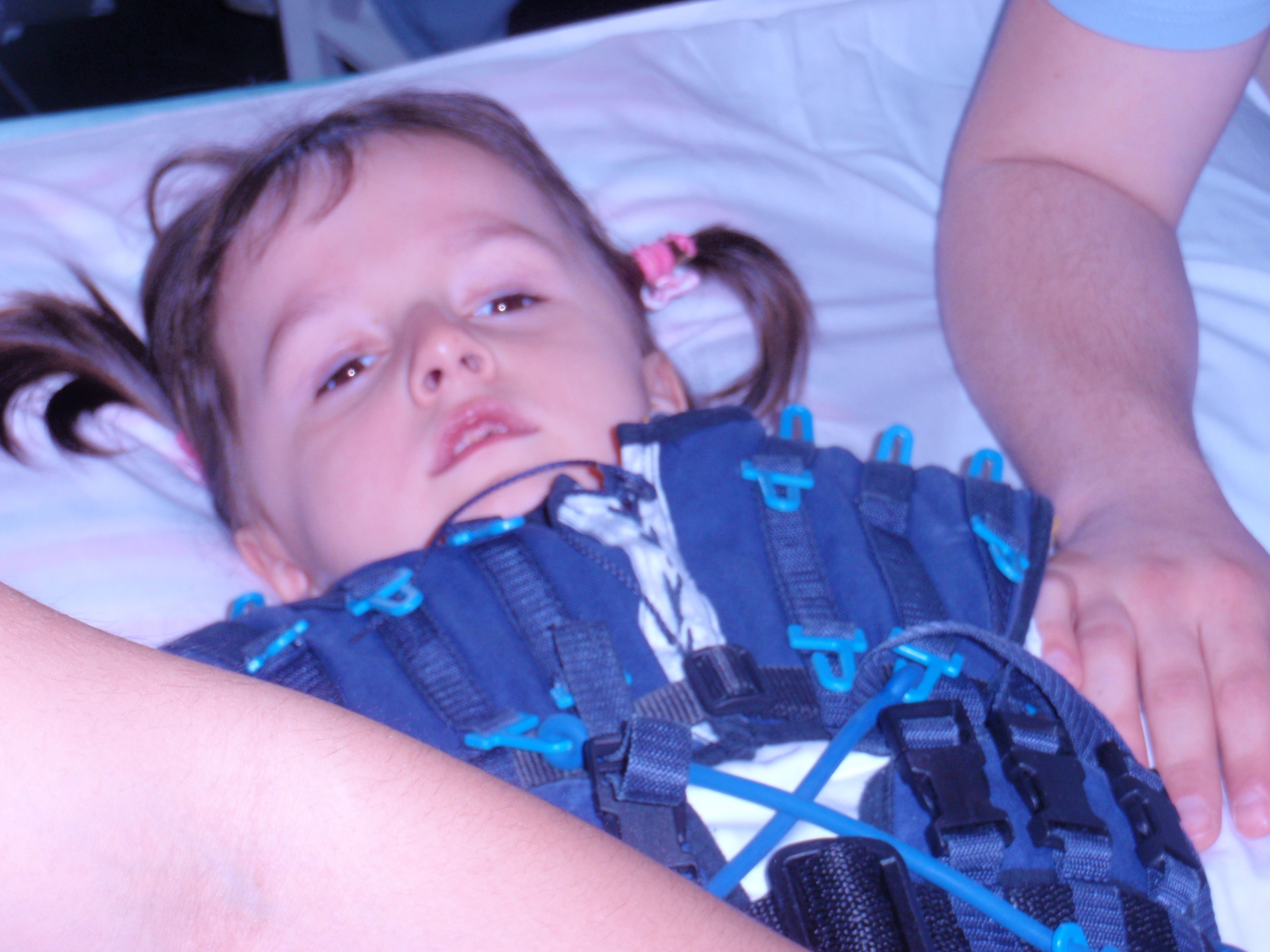 Pred šiestimi rokmi sme s manželom (teraz už s exmanželom) čakali vytúžené dieťa... Tehotenstvo prebiehalo v poriadku, dieťatko bolo veľké, preto som bola pre každý prípad pri pôrode pripravovaná aj na sekciu, ale lekárka sa rozhodla pre klasický spôsob. Keďže bábätko sa nemohlo dostať na svet "pomohli" mu pôrodným zvonom a keďže sme už obe - ja aj Evelinka - bojovali o prežitie, brucho tlačili aj sestričky, čo malo za následok poškodenie dieťatka. Evelinka ako prvé moje dieťa vážila 4,3 kg a výšku mala 56 cm. Po pôrode nastali hneď komplikácie - nefungoval sací reflex, dieťa sa ťažko hýbalo a veľmi potilo... mala dolámané obe kľučné kostičky, paresis pl. brachialis, hypotinický syndróm, nálezy komôr na srdiečku, makrocefaliu a do 5. mesiaca jej veku vzhľadom na veľkú potivosť sme žili v tom, že Evelinka má cystickú fibrózu. Tú však vyšetrenia v B.Bystrici vylúčili a tak začali lekári hľadať ďalšie diagnózy, ale neúspešne... Evelinka mala obrovské problémy s pohybom, nedokázala dvíhať ani hlavičku, cvičili sme Vojtovku, chodili po množstve vyšetrení po celej republike, po rehabilitáciách... lekárka určila neidentifikovanú detskú mozgovú obrnu, ktorú však ďalšie vyšetrenia ani špeciálne testy v Nemecku nepotvrdili. Každý deň som z dcérky stolicu vyšparávala, konečník mala vždy krvavý, lebo svaly stolicu v črievkach neposúvali, mala problémy nielen s trávením a vyprázdňovaním, ale zaostávala aj po mentálnej a pohybovej stránke. Keďže liečebné rehabilitácie v ADELI Medical Centre v Piešťanoch nám poisťovňa nepreplácala, prosili sme o peniažky, kde sa dalo, oslovovali sme rôzne nadácie i charitatívne zbierky, či darcov 2% zo zaplatenej dane. Vo veku 1,5 roka Evelinky sme sa s manželom rozviedli a na všetko som ostala sama. Pomáhali mi moji rodičia a krátky čas občas aj exsvokrovci. V súčasnej dobe mi vyše dva roky s dcérkou pomáha priateľ. Evelinka má v súčasnej dobe už 5,5 roka , začala samostatne chodiť po rovnom teréne, pri prekážkach potrebuje moju oporu, nič nerozpráva, je stále plienkovaná, ďalej chodíme po vyšetreniach, lebo lekári ešte neupresnili jej diagnózu... a kde nie je presná diagnóza, nie je ani špecifikovaná liečba... 4- krát absolvovala ADELI, čo nás aj mojich rodičov stálo množstvo peňazí... Rehabilitácie aj hyperbarická komora v ADELI jej účinne pomáhajú, ale to si vyžaduje ďalšie financie... a Evelinka rastie... potrebovala by častejšie rehabilitovať v ADELI, na čo už nemáme ani my ani moji príbuzní dostatok peňazí. Prosíme všetkých dobrých ľudí, ktorým nie sú ľahostajné choré detičky, o pomoc, za čo Vám vopred Evelinka, ja aj jej najbližší srdečne ďakujeme.