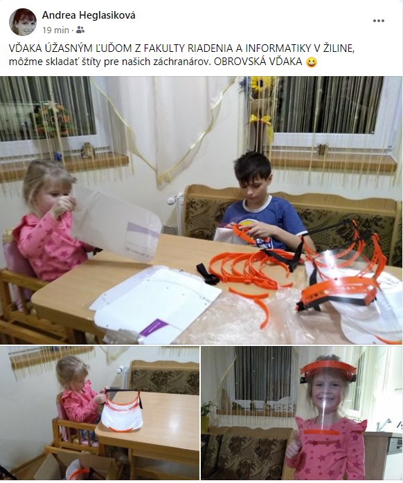 Prvú dodávku kompletných štítov sme realizovali vo štvrtok 26.3. a ku dnešnému dňu sme dodali ochranné štíty v celkovom počte 140 ako dar pre Hornooravskú nemocnicu s poliklinikou Trstená, Fakultnú nemocnicu s poliklinikou Žilina, SENIOR – Zariadenie pre seniorov a Domov sociálnych služieb, Vrútky, Ambulanciu rýchlej zdravotnej pomoci Turzovka.