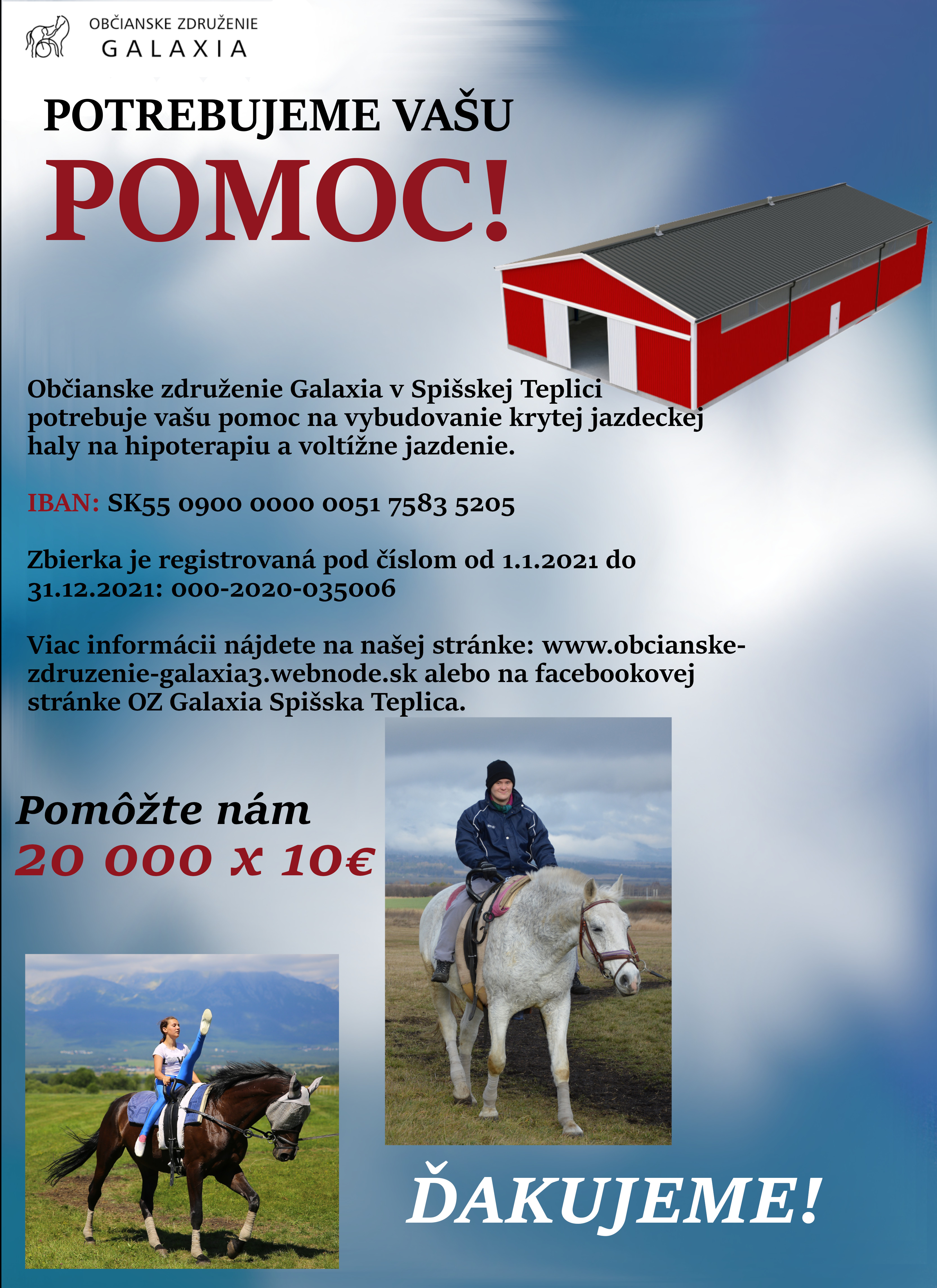 Občianske združenie Galaxia by chcelo získať finančné prostriedky na výstavbu krytej jazdiarne na hipoterapiu pre handicapovaných, a na voltížne jazdenie, pre rozvoj športových aktivít detí a mládeže na vykonávanie počas celého roka.
